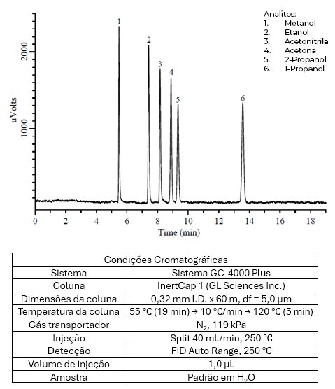 No post de hoje, apresentamos um método utilizando cromatografia gasosa voltado para a análise de álcoois e cetonas em água, com destaque para a detecção de metanol. A análise foi realizada em um sistema GC-4000 Plus, utilizando a coluna InertCap 1 da GL Sciences, permitindo a separação e identificação de seis compostos específicos, incluindo metanol, etanol e acetona. Cada analito foi detectado em uma concentração extremamente baixa de 50 ppm (v/v), evidenciando a alta sensibilidade e precisão do método. Os resultados, apresentados abaixo, mostram a resposta do detector ao longo do tempo, comprovando a capacidade do sistema de identificar e quantificar metanol em níveis seguros e relevantes para a fiscalização e controle de qualidade de bebidas alcoólicas.