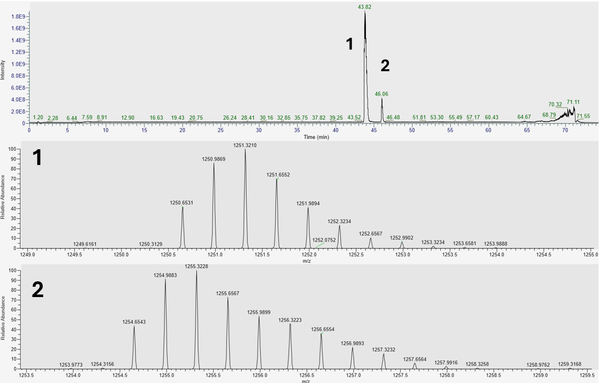 Figura 1: Análise detalhada da Liraglutida. Painel superior: cromatograma obtido por gradiente longo, mostrando o pico principal em 43,82 min (analito de interesse) e um pico de impureza em 46,06 min. Painéis intermediário e inferior: espectros de massas correspondentes, evidenciando os diferentes estados de carga e pequenas variações de massa (Da) relacionadas a impurezas ou modificações da molécula.
