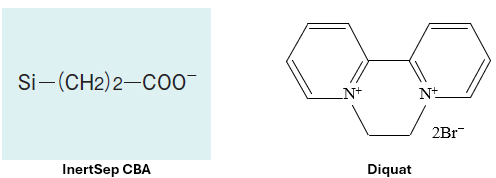 Neste estudo, utilizou-se o cartucho InertSep CBA da GL Sciences, desenvolvido com grupos carboxila funcionalizados, que atuam como sítios de troca catiônica fraca. O Diquat, sendo um composto catiônico em condições neutras, interage com esses grupos por atração eletrostática, garantindo retenção eficiente durante o pré-tratamento. A matriz de sílica inerte do cartucho minimiza interações não específicas, proporcionando alta seletividade e recuperação confiável do analito, mesmo em águas complexas, como água da torneira ou ultrapura.