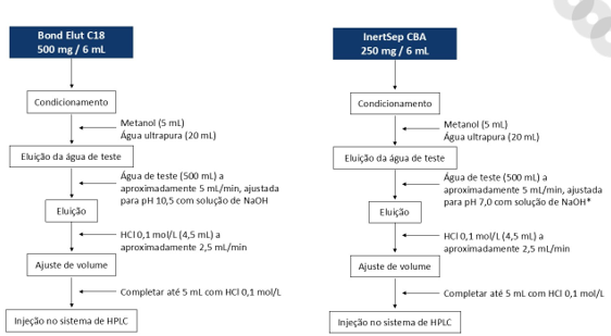 Figura 1: Procedimento para concentração de água utilizando SPE (100x) com (a) Bond Elut C18 e (b) InertSep CBA.