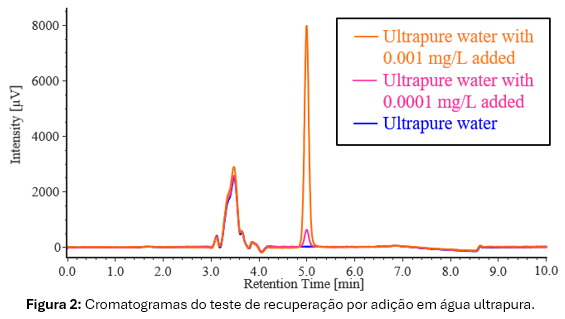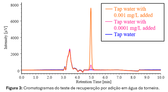 O InertSep CBA foi então selecionado para a extração de amostras reais. Foram analisadas soluções sem Diquat e soluções com 0,0001 e 0,001 mg/L de Diquat em água ultrapura e água da torneira.