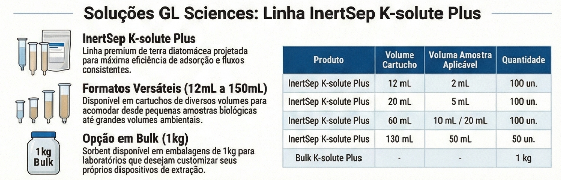 Para laboratórios que buscam implementar essa abordagem, a linha InertSep K-solute, da GL Sciences, oferece soluções desenvolvidas especificamente para SLE. Os cartuchos são preenchidos com terra diatomácea de alta qualidade e projetados para facilitar a aplicação da técnica em diferentes volumes de amostra.